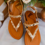 Sandália rasteirinha VIVAGUI couro sola caramelo tiras douradas com detalhes dourados em tachas fecho ajustável