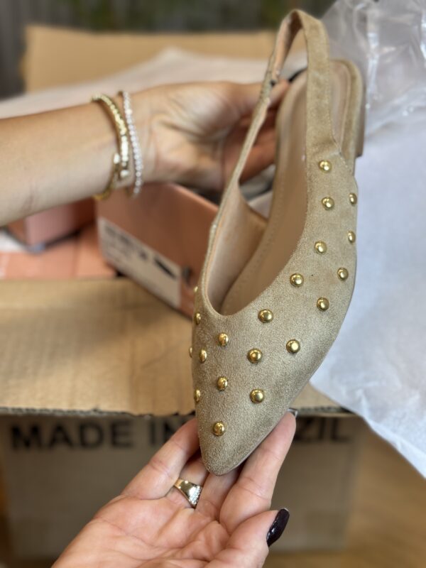 Sapatilha Slingback em couro, na cor Avelã, com aplicação de tachas douradas — o equilíbrio perfeito entre elegância e atitude.