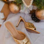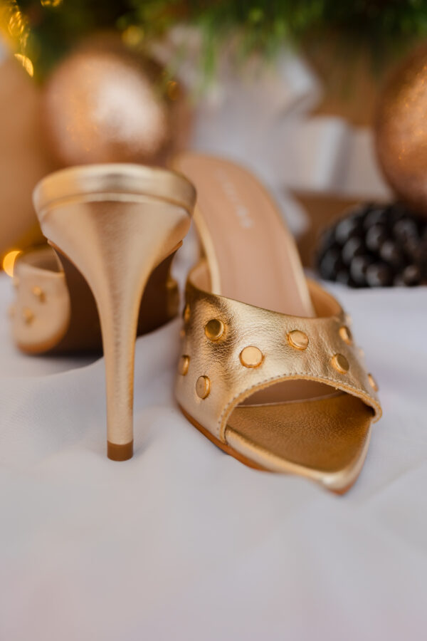 Tamanco LIALINE santo fino dourado com detalhes dourados, abertura na frente, couro.
